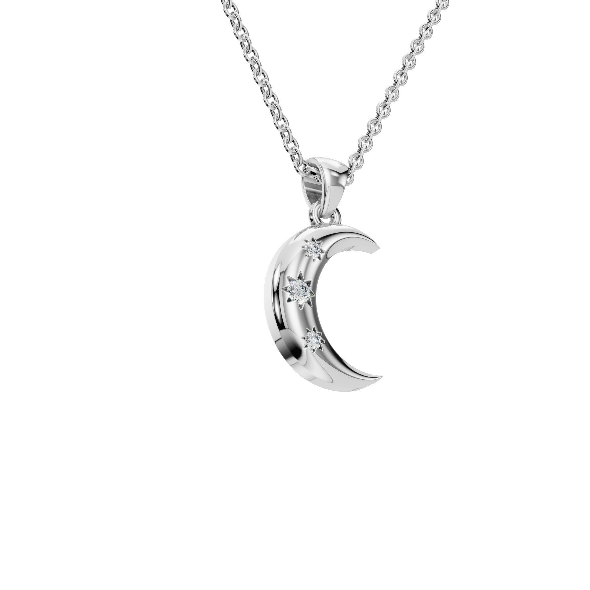 Celebrate a love that continues to grow, just like the moon itself. The Eternal Moonlight Lab Grown Diamond Crescent Necklace is a poetic symbol of devotion, transformation, and everlasting connection. Crafted in radiant gold, the softly sculpted crescent embraces sparkling lab grown diamonds that shimmer like stars in the night sky. The diamonds are delicately secured in refined star-inspired prongs along the crescent curve. Anniversary Dinners & Romantic Evenings – A subtle yet meaningful sparkle that complements elegant outfits.