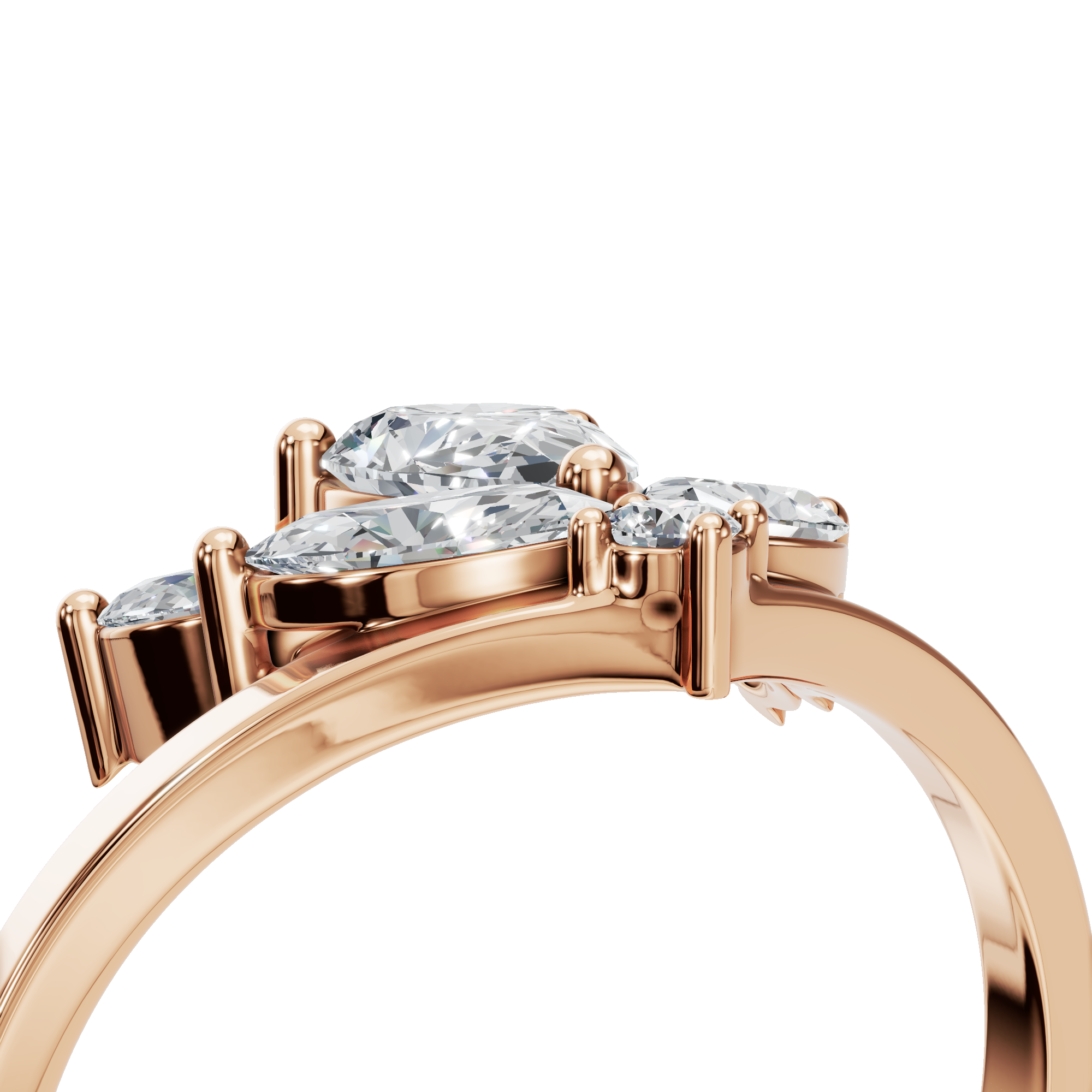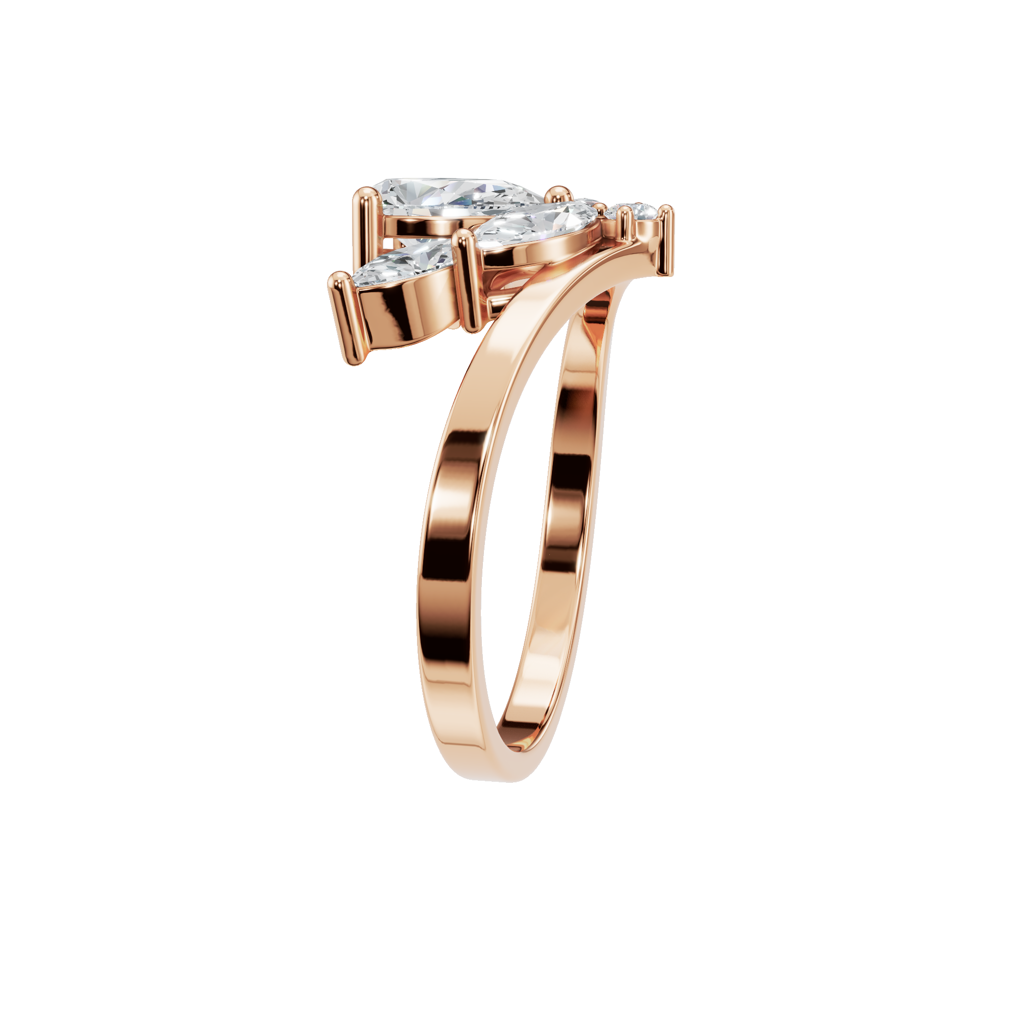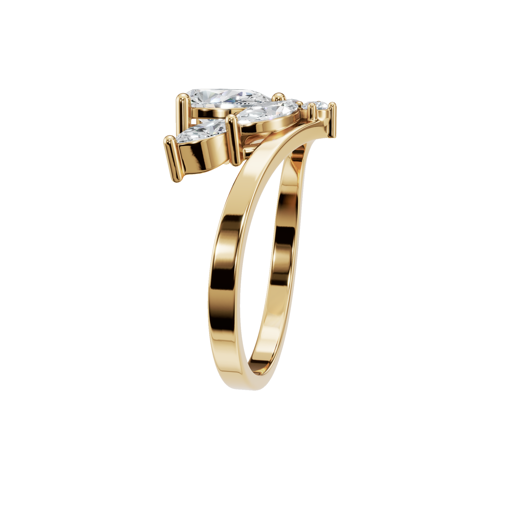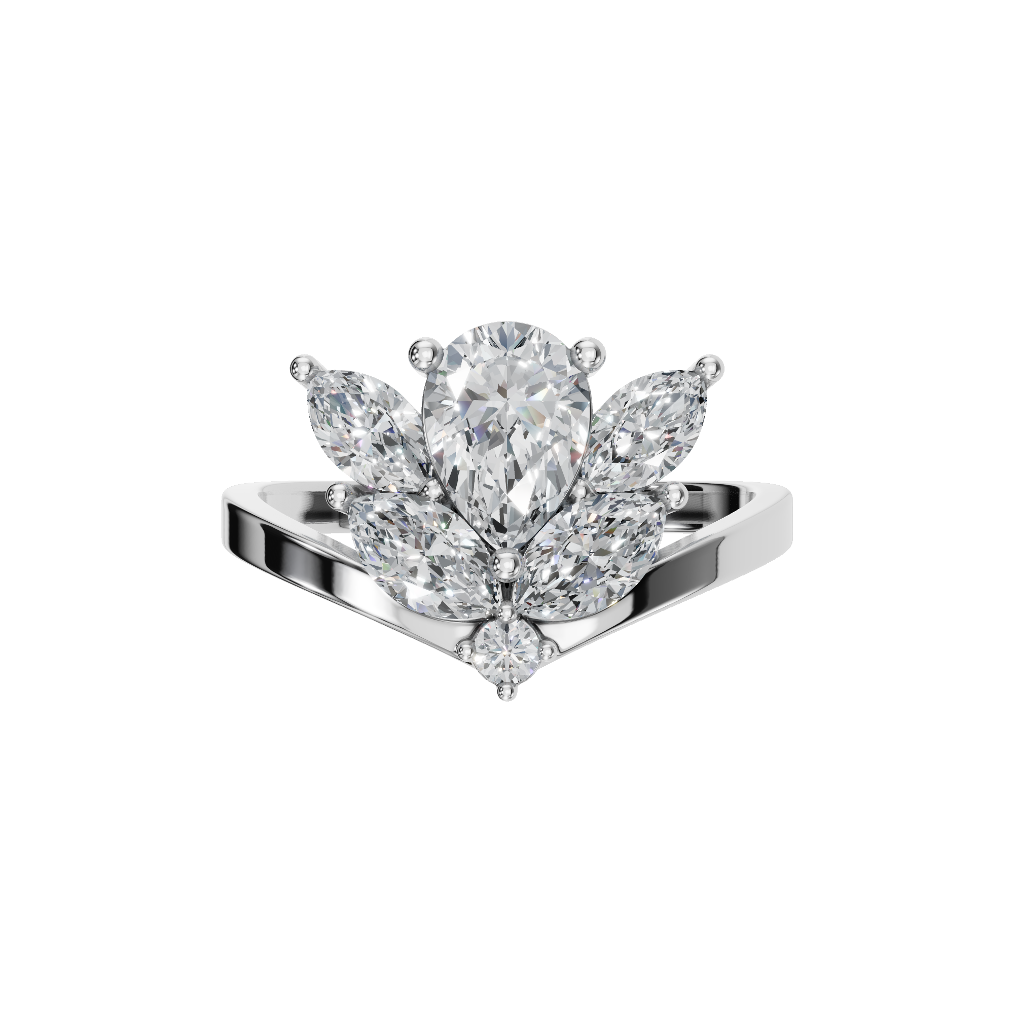 Inspired by the elegance of nature, this pear diamond ring features a beautifully detailed floral cluster design that brings soft movement and radiant sparkle to the hand. At its heart, a luminous pear-shaped diamond creates a graceful focal point, symbolizing elegance and individuality. The center stone is securely set in a classic prong setting, allowing maximum light to enhance its brilliance. Surrounding marquise-cut diamonds are also prong-set, arranged like delicate petals to form a blooming floral silhouette.
