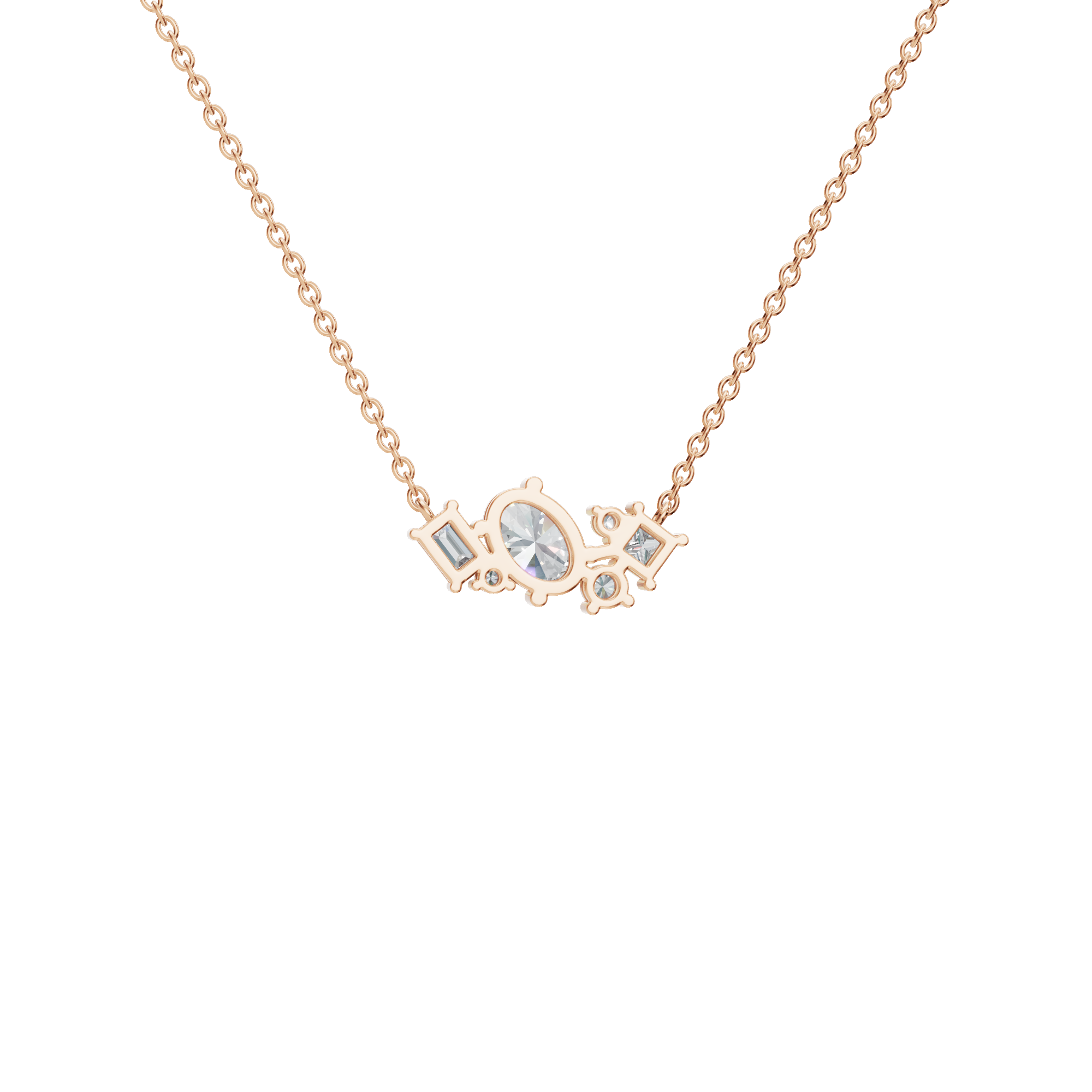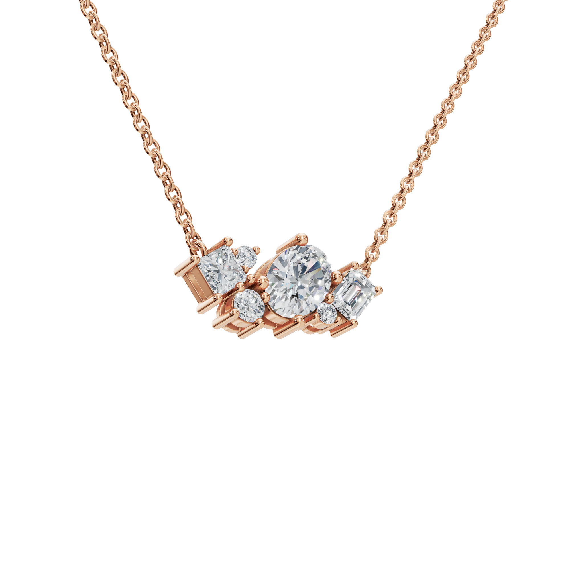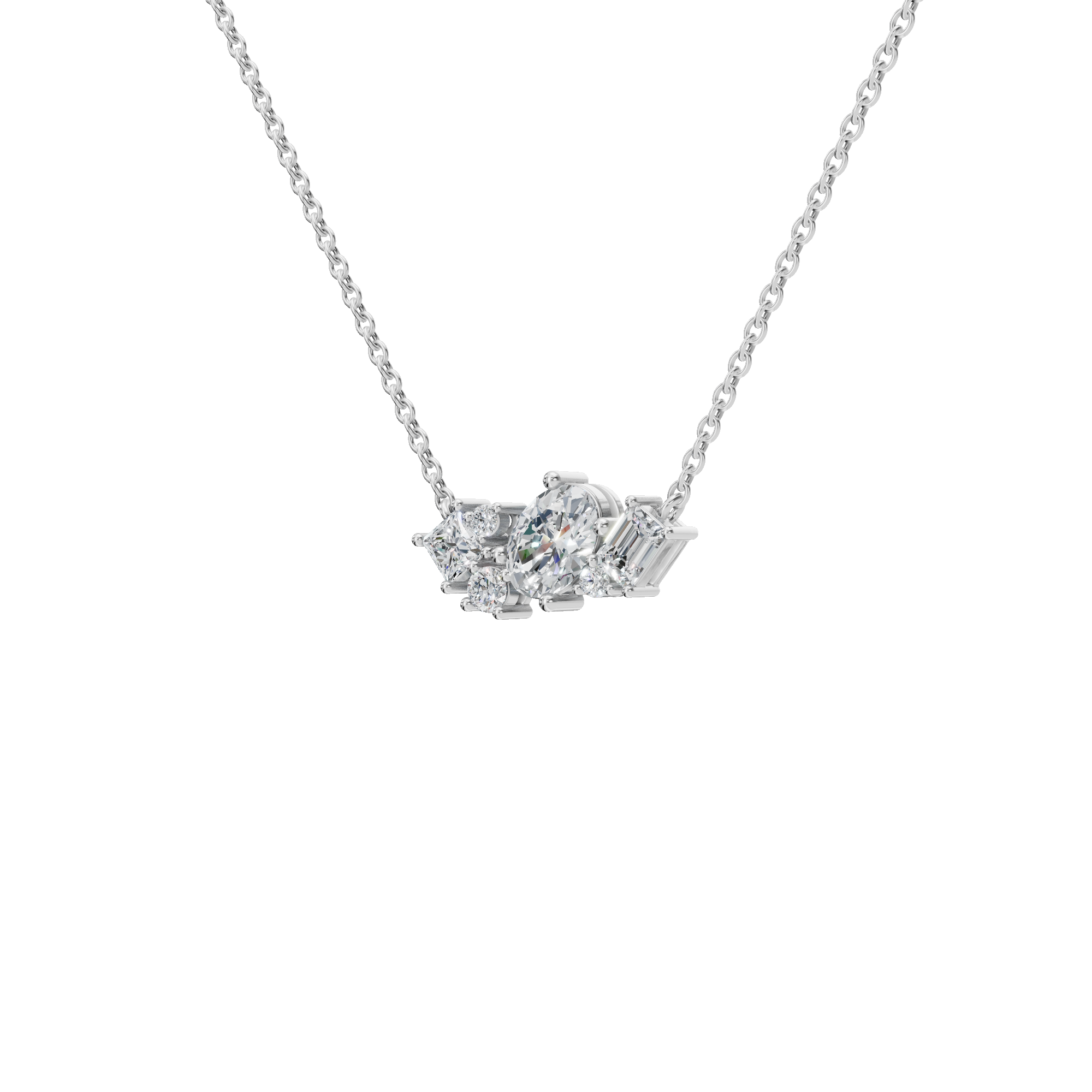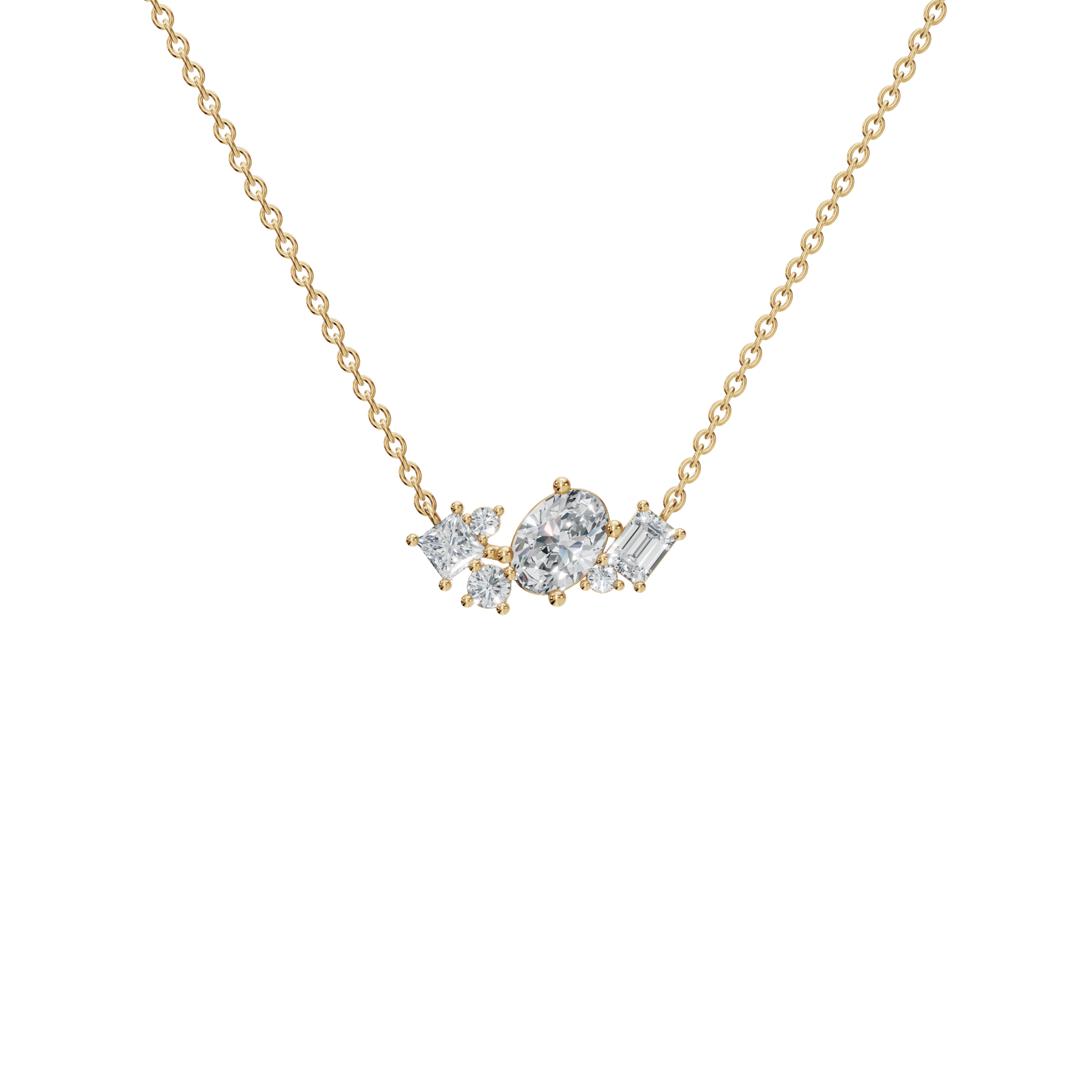 Striking in balance and refined in detail, the Round and Baguette Diamond Cluster Necklace is a sophisticated expression of modern fine jewelry. At the center of the design, brilliant round-cut diamonds offer exceptional sparkle and softness, while baguette-cut diamonds introduce clean lines and a sleek, contemporary edge. This interplay of shapes creates depth and visual interest, allowing the necklace to catch and reflect light from multiple angles. Each diamond is expertly secured in a combination prong and bar setting.